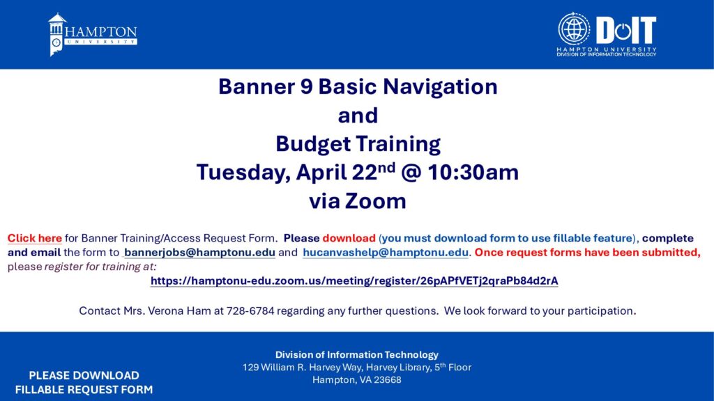 Banner 9 Basic Navigation and Budget Training Tuesday, April 22nd @ 10:30am via Zoom
