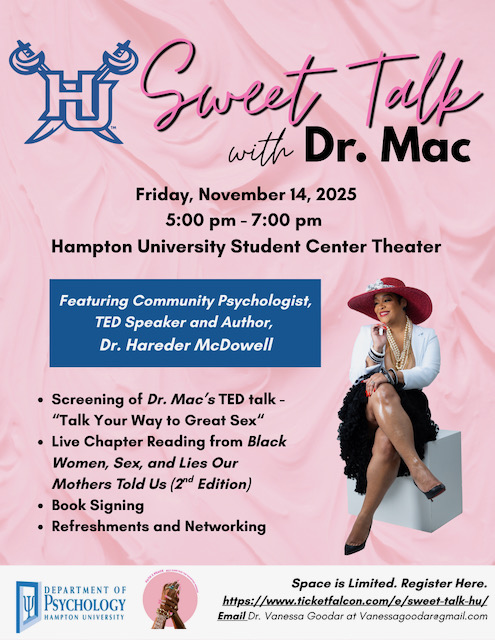 Friday, November 14, 2025 | 5:00 PM – 7:00 PM Hampton University Student Center Theater Join the Hampton University Department of Psychology and the HU Path 2 P.E.A.C.E. Community Psychology & Self-Care Research Lab for an evening of learning and empowerment featuring Dr. Hareder McDowell— Community Psychologist, TED Speaker, and author of “Black Women, Sex, […]