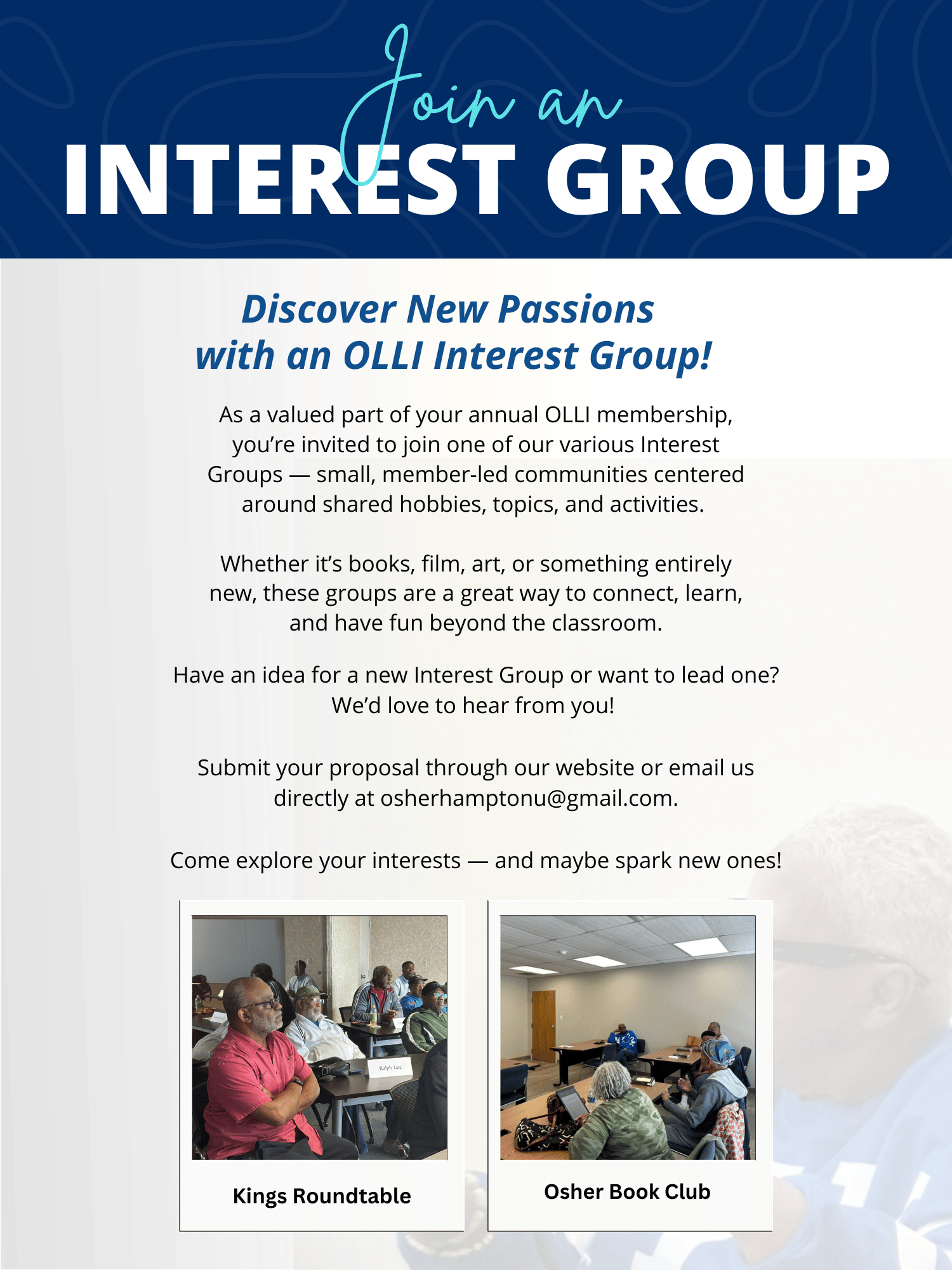 Experience the joy of lifelong learning with Osher at Hampton University! Our diverse range of activities offers something for everyone, from stimulating lectures and engaging workshops to exciting excursions and social events. Join a community of curious minds, make new friends, and expand your horizons. Whether you’re interested in arts, history, technology, or wellness, you’ll find a welcoming space to explore your passions and discover new ones. Participate in our activities and be part of a vibrant, intellectually enriching environment that celebrates the love of learning at any age.